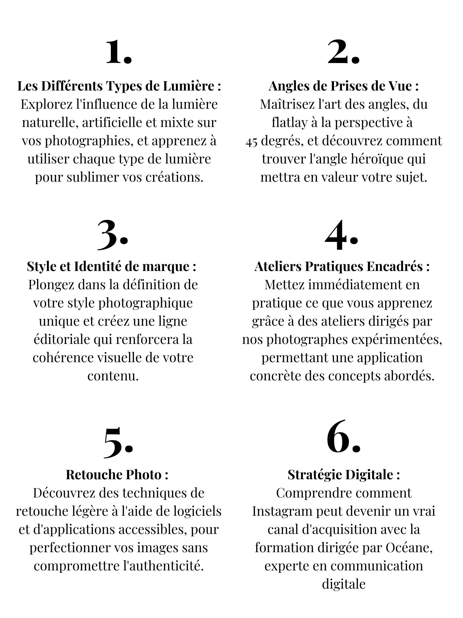 Au cours de cette formation unique, nous vous guiderons dans la création d'images qui reflètent votre style personnel. Notre objectif est de rendre la photographie accessible à tous, même si vous n'avez pas d'expérience préalable dans ce domaine.